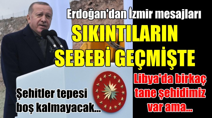 Cumhurbaşkanı Erdoğan, Manisa yolu üzerindeki Sabuncubeli tüneli ve bağlantı yolları ile Konak Tüneli'ni hizmetinize sunduklarını belirterek, "27 kilometrelik Kemalpaşa demiryolu bağlantısı, 136 kilometrelik Aliağa- Selçuk arasındaki İZBAN'ı şehrimize kazandırdık mı, Kemalpaşa OSB'ye demiryolu bağlantı hattını kurduk. İzmir- Ankara arasını 3 buçuk saate düşürecek yüksek hızlı tren hattının da şu anda yapımı devam ediyor. Yakında ihalesine çıkıyoruz. İçinde otoyol ve raylı sistemlerinin olduğu, İzmir Körfez Projesi'nin etüt planını tamamladık, imar planı çalışmaları sürüyor. Selçuk-Ortaklar arasında yeni bir demir yolu hattı ve ikinci hat yapımının proje çalışmaları tamamlandı. Adnan Menderes Havalimanı'nı baştan aşağı yeniledik. Tarımda İzmir'e son 17 yılda yaklaşık 4 buçuk milyar TL hibe desteği verdik ve 6.6 milyar TL de orman su yatırımı yaptık. Kırsal kalkınma destekleri kapsamında 38 projeye toplam 23 milyon TL'lik hibe ödemesi gerçekleştirdik. Tarıma dayalı ihtisas sera organize sanayi bölgesini Dikili'de kuruyoruz, bununla birlikte toplamda 1 milyar TL'lik yatırım yapıyoruz. 2020 yılında İzmir ve ilçelerinde toplam 46 adet tarım kredi kooperatif marketini hizmete açacağız. Bu sene 70 bin 500 dekar alanda çalışma yaparak 26 milyon fidanı toprakla buluşturacağız. Bu yıl 4 milyon adet fidan üreteceğiz. Kemalpaşa Nazarköy'de ormanlık alanda 20 kilometre yürüyüş parkuru olan ve 3 bin yıllık Hitit Anıtı'nı ön plana çıkaran ekoturizm alanı açacağız. İzmir'imize 1 şehir ormanı, 8 mesire yer ve 3 bal ormanı tesis edeceğiz. Bugüne kadar 28 baraj ve 3 göl inşa ettik, 14 baraj daha inşa ediyoruz. Son 17 yılda yaptığımız sulama tesisleriyle 547 bin dekar araziyi sulamaya açtık. İzmir kısa bir süreye kadar susuzdu. Biz Gördes Barajı'nı yaptık, onunla İzmir'i suya kavuşturduk: Halbuki bu görev İzmir Büyükşehir Belediyesi'nindi ama yapmadılar, yapamadılar, onu da biz gerçekleştirdik. 3 yeni OSB, 2 endüstri bölgesi 4 teknopark 91 AR-GE merkezi, 29 tasarı merkeziyle şehrimizi cazibe merkezi haline dönüştürdük. Verdiğimiz teşvikler ve kurduğumuz OSB'ler sayesinde son 17 yılda İzmir'de ilave 174 bin 400 istihdam sağladık. Endüstri bölgeleri tam kapasiteyle üretime geçtiğinde cari açığımızı yılda 2 milyar dolara yakın azaltacak. İzmir ve 25 ilçesine doğalgazı getirdik, inşallah önümüzdeki dönemde bu yatırımları sürdüreceğiz" dedi.