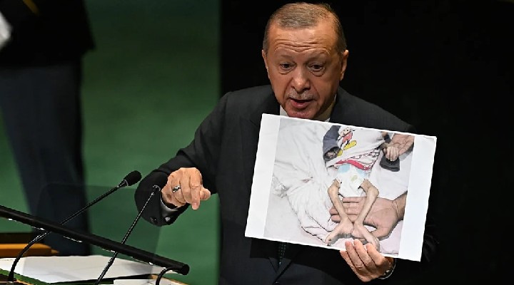 - Toprağı insan ve hayvan için de bitki için de işe yaramaz hale getiriliyor. Şimdi size soruyorum; elimdeki şu fotoğrafın güvenlik arayışıyla ne ilgisi var? Bunun adına canlıya düşmanlık, hayata düşmanlık değil midir? Bu kürsüden açık ifade ediyorum; Gazze'de bir savaş yoktur. İki taraftan söz edilemez. Bir yanda elinde en modern, öldürücü silahlar olan d üzenli ordu, diğer tarafta ise masum siviller ve çocuklar vardır. Bu terörle mücadele değildir. 7 Ekim olayı öne sürülerek yürütülen işgal, tehcir, sürgün, soykırım daha doğrusu toplu kıyım politikasıdır.