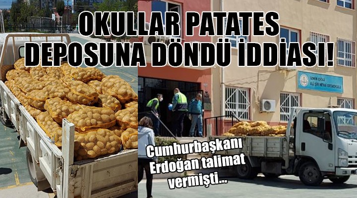 SONKALEİZMİR-Tarım ve Orman Bakanlığı tarafından Toprak Mahsulleri Ofisi kanalıyla ihtiyaç sahibi yurttaşlara dağıtımı yapılan patateslerin bir kısmının bazı okullarda depolandığı iddia edildi. İzmir Çiğli Ali Şir Ortaokulu ile Balıkesir'in Burhaniye ilçesindeki Mustafa Keskin okulunun bahçesinde patates yüklü kamyonların olduğu görüntüler ortaya çıktı.