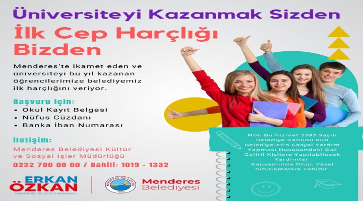 Menderes’te ikamet eden ve üniversiteyi kazanan öğrencilere yönelik hazırlanan projede başvurular belediyeye yapılacak. Öğrenciler okul kayıt belgesi, nüfus cüzdanı, banka IBAN numarası gösterir belge ile başvuru yapabilecek. Yapılan değerlendirme sonunda hak kazanan öğrencilere belediye tarafından 2 bin TL destekte bulunulacak.