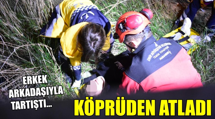 Olay, saat 06.00 sıralarında Zafer Payzın Köprüsü'nde meydana geldi. Erkek arkadaşıyla henüz belirlenemeyen bir nedenle tartışan K.K., köprüden İZBAN raylarının olduğu tarafa atladı. K.K. şans eseri, rayların yakınındaki toprak zemine düştü. Genç kızın atladığını gören bir kişi, durumu sağlık ve polis ekiplerine bildirdi. İhbar üzerine bölgeye gelen polis, demir korkulukları geçemedikleri için itfaiye ekiplerinden yardım talep etti. Bunun üzerine olay yerine gelen itfaiye ekipleri, demir korkulukları keserek yol açtı. Rayların bulunduğu yere giren itfaiye ve sağlık ekipleri, K.K.'yi bulunduğu noktadan çıkarttı. Kurtarılan genç kız, ambulansla Ege Üniversitesi Tıp Fakültesi Hastanesi'ne kaldırıldı. Burada tedaviye alınan K.K.'nin sağlık durumunun iyi olduğu öğrenilirken, polis ekipleri olayla ilgili soruşturma başlattı.