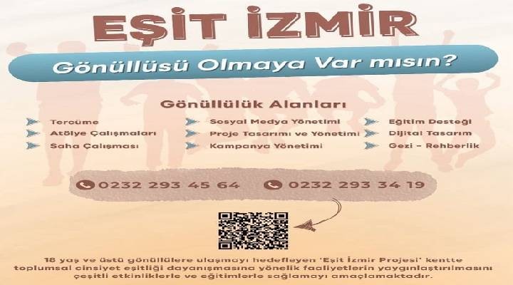 Kadınların ve kız çocuklarının güçlenmesi ve toplumsal cinsiyet eşitliğinin sağlanması için Eşit İzmir projesini başlatan İzmir Büyükşehir Belediyesi, kentte toplumsal cinsiyet eşitliği dayanışmasını pekiştirmeyi amaçlıyor. 18 yaş üzeri gönüllülere ulaşmayı hedefleyen projeye katılmak için https://stratejikyonetimsistemi.izmir.bel.tr/survey/4906 adresindeki başvuru formunu doldurmak gerekiyor. Projenin gönüllülük alanları; tercüme, atölye çalışmaları, saha çalışması, sosyal medya yönetimi, proje tasarımı ve yönetimi, kampanya yönetimi, eğitim desteği, dijital tasarım, gezi-rehberlik konularını kapsıyor.