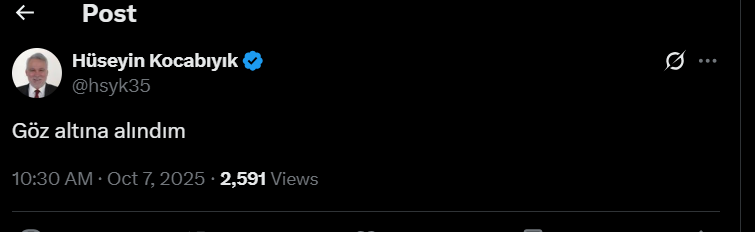 Eski AK Parti milletvekili Hüseyin Kocabıyık'ın gözaltına alındığı öğrenildi. Kocabıyık, sosyal medya hesabından paylaşım yaparak gözaltına aldığını bildirdi.