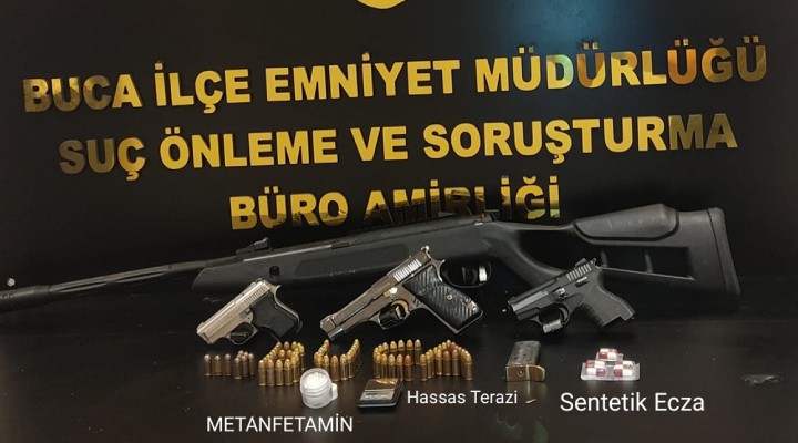Gözaltına alınan şüphelinin evindeki aramada, 3 tabanca, 75 fişek, havalı tüfek, hassas terazi, 15 gram metamfetamin ile 8 uyuşturucu hap ele geçirildi.
