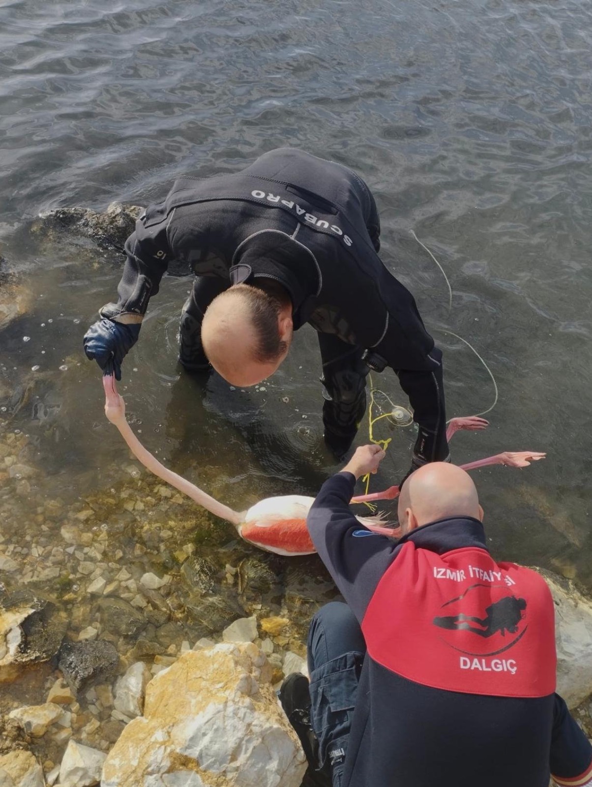 İzmir Büyükşehir Belediyesi İtfaiye Dairesi Başkanlığı ekipleri, doğal yaşamın korunması için müdahalelerini sürdürüyor. Geçtiğimiz haftalarda İnciraltı'nda ayağına olta misinası dolanan bir flamingoyu kurtaran İzmir İtfaiyesi, bu kez balıkçılık amacıyla hazırlanmış bir tuzağa takılan flamingoyu sağ salim kurtardı. İnciraltı Kent Ormanı’nda deniz kenarında mahsur kalan flamingonun ayağına ip dolandığı ihbarı üzerine harekete geçen İzmir İtfaiyesi Su Altı ve Su Üstü Arama Kurtarma Birimi dalgıçları, 15 dakikalık bir çalışma ile flamingonun vücuduna dolanan ipleri güvenli bir şekilde çıkardı. İlk kontrollerde sağlık durumu iyi olduğu belirlenen flamingo, tekrar doğasına bırakıldı. İzmir İtfaiyesi yetkilileri, doğayı, çevreyi ve yaban hayatını koruma çalışmalarını sürdürüyor. Yurttaşlara, balıkçılık sonrası misina ve benzeri atıkları doğaya bırakmamaları, çevreye karşı duyarlı olmaları çağrısında bulunuldu.