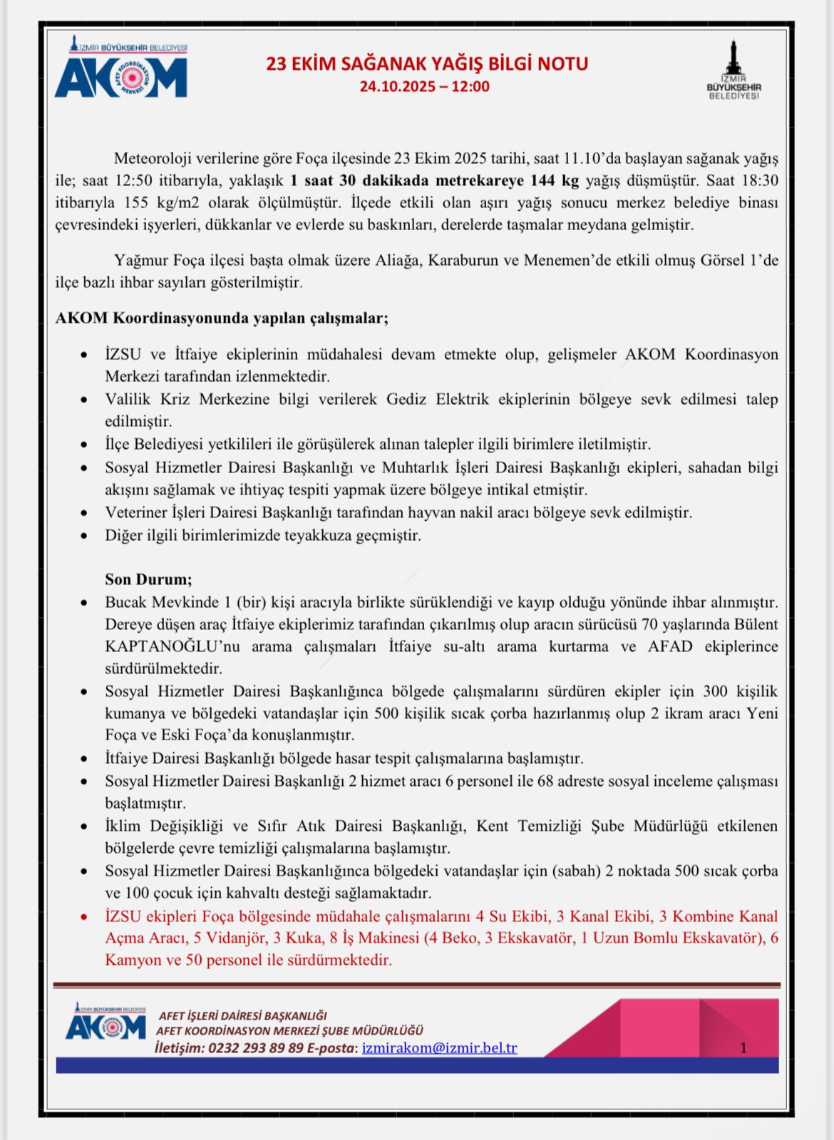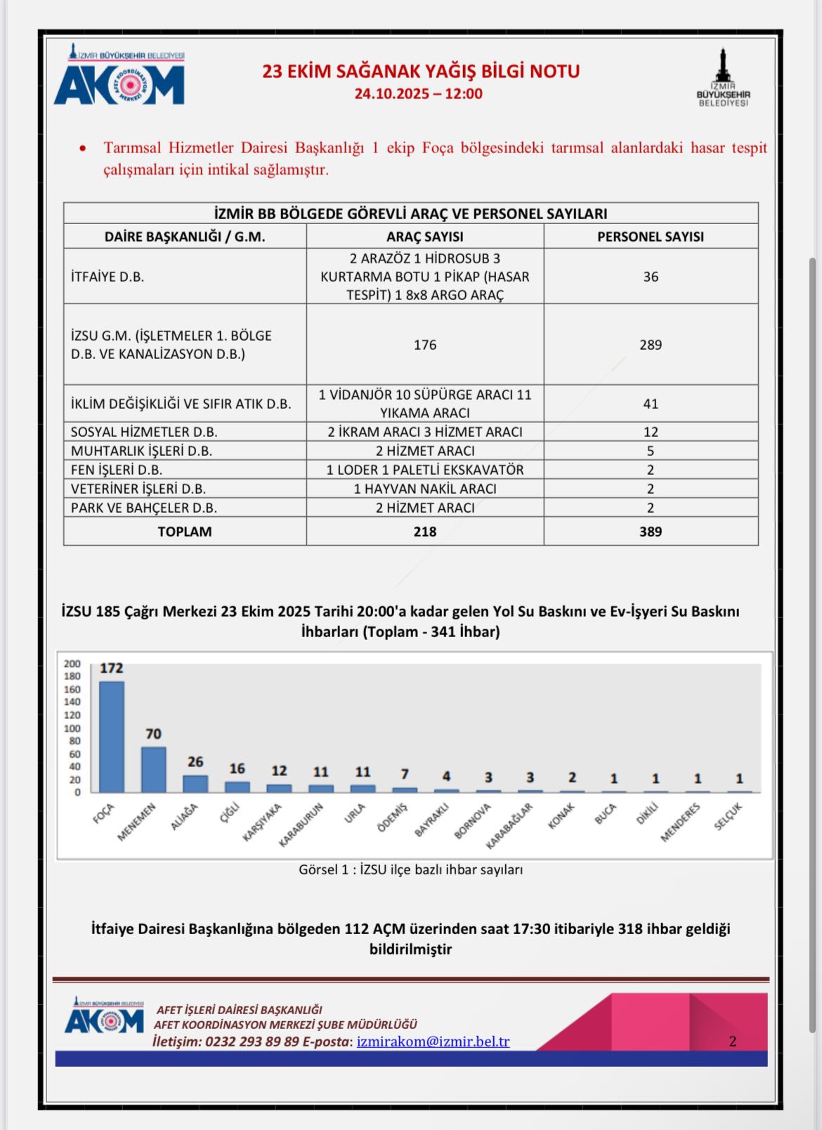 İzmir Büyükşehir Belediyesi Afet Koordinasyon Merkezi( AKOM)'nden yapılan açıklamada şu ifadelere yer verildi: