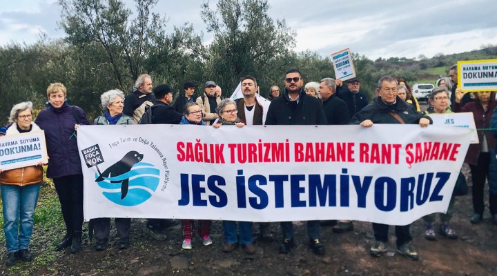 FoFoça Belediyesi tarafından projenin iptali için açılan davanın mahkeme bilirkişi heyeti, ilçe halkı tarafından projenin Foça’ya vereceği zararları ifade eden pankartlarla karşılandı.
