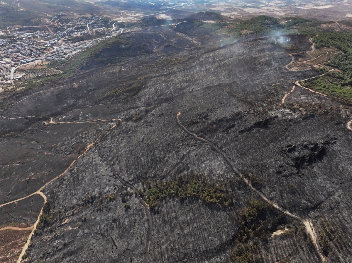Orman Bölge Müdürlüğü ve İzmir İtfaiyesi ekiplerinin soğutma çalışmalarını sürdürdüğü yangında yaklaşık 340 hektar arazinin hasar gördüğü belirlendi.