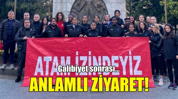 Konak Belediyesi Kadın Futbol Takımı, Turkcell Kadınlar Süper Ligi 2021-2022 sezonu devre arasına galibiyetle girdi. Samsun deplasmanında İlkadım Belediyesi Yabancılar Pazarıspor’u 2-1 mağlup eden mavi beyazlı ekip, maç sonrası, geçtiğimiz günlerde uğradığı çirkin saldırıyla gündeme gelen Atatürk Anıtı’nı ziyaret etti. Konak Belediyespor’un kadın futbolcuları “Atam İzindeyiz” yazılı pankart açarak Ulu Önder Mustafa Kemal Atatürk’e, başta Cumhuriyet olmak üzere bıraktığı eser ve değerlerine sahip çıkacaklarının sözünü verdi.