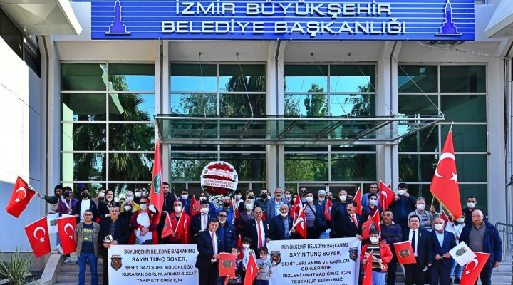 Türkiye Harp Malulü Gaziler, Şehit Dul ve Yetimleri Derneği İzmir Şubesi, yerel yönetimlerin yetki alanındaki sorunlarının hızla çözülmesi için Sosyal Hizmetler Dairesi Başkanlığı bünyesinde Şehit Aileleri ve Gaziler Şube Müdürlüğü’nü kuran İzmir Büyükşehir Belediye Başkanı Tunç Soyer’e basın açıklamasıyla teşekkür etti. Gaziler ve şehit yakınları ellerinde taşıdıkları teşekkür pankartlarıyla Kültürpark’taki İzmir Büyükşehir Belediyesi Hizmet Binası’nın önüne çelenk ve çiçek bıraktı.
