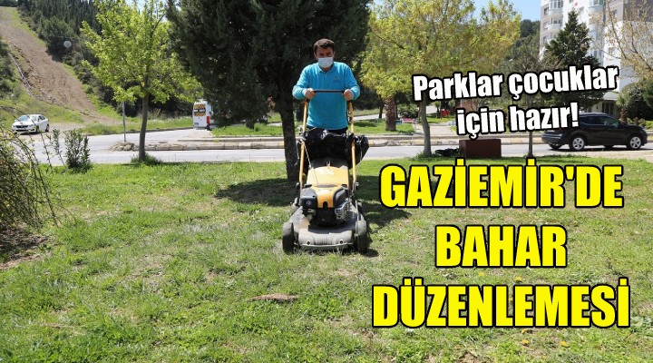 Gaziemir Belediyesi Park ve Bahçeler Müdürlüğü ekipleri, ilçedeki, 595 bin metrekarelik 159 park ve yeşil alanda çalışmalarını sürdürüyor. Parklarda yürütülen çalışmalar kapsamında parkların tüm eksikleri gideriliyor. Belediye ekipleri, parklardaki oyun gruplarının tamirini yapıyor, kullanılamaz durumda olanları ise yenileriyle değiştiriyor.