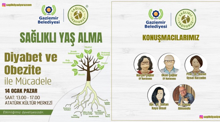 Gaziemir Belediyesi ile Sağlıklı Yaşıyoruz iş birliğinde düzenlenen “Sağlıklı Yaş Alma” buluşmalarının üçüncüsü 14 Ocak Pazar günü Atatürk Kültür Merkezi’nde gerçekleştirilecek. Sağlıklı Yaşıyoruz kurucuları Nurçin Çağlar ve A. Okan Çağlar’ın moderatörlüğünde düzenlenecek toplantı, Diyabet ve Obezite ile Mücadele başlığıyla düzenlenecek. Sağlıklı Yaşıyoruz doktorlarının, obezite ve diyabetin kök sebeplerinin yanı sıra diğer kronik hastalıklarla ilişkisinin de masaya yatıracağı toplantıda bu hastalıklardan korunma ve tedavi yöntemleri hakkında önemli bilgiler paylaşılacak. Toplantıda, Prof. Dr. Nazan Uysal Harzadın, “Diyabet Yaşam Şekli Sorunu: Vücudunuz Size Bir Şeylerin Yolunda Gitmediğini Anlatmaya Çalışıyor,” Opr. Dr. Sultan Kaya Ünsal, “Diyabetin Göze Etkileri” ve Dr. Vahap Almasulu “Çağımızın Salgını Diyabeti Durduralım” başlıklarında sunum yapacak. Nurçin Çağlar ile Okan Çağlar, diyabet ve obeziteden nasıl kurtulduklarını, bu süreçte yaşadıkları deneyimleri dinleyicilere anlatacak.