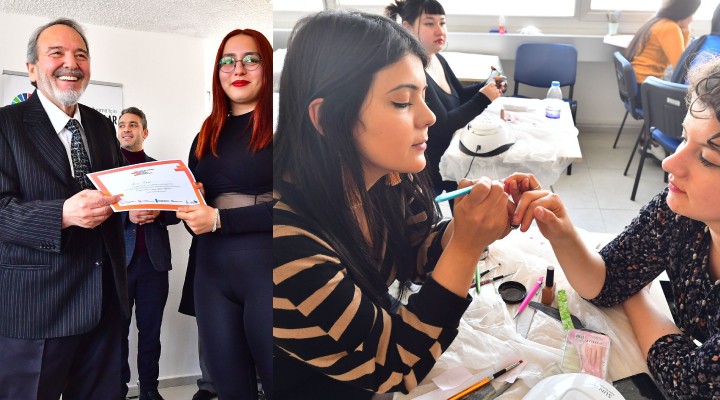İşgücü potansiyelini attırmak ve kalifiye eleman yetiştirmek üzere hizmet veren İzmir Büyükşehir Belediyesi Meslek Fabrikası’nda protez tırnak ve tırnak sanatı (nail art) kursu alan 25 öğrenci sertifikalarını törenle aldı. Yenişehir Kurs Merkezi’nde düzenlenen törene İzmir Büyükşehir Belediyesi Genel Sekreter Yardımcısı Ertuğrul Tugay, İzmir Büyükşehir Belediyesi Sosyal Projeler Dairesi Başkanı Anıl Kaçar, Birleşmiş Milletler Kalkınma Programı Koordinatörü Güvenç Küçüktok, İzmir Kuaförler Manikürcüler ve Güzellik Salonu İşletmecileri Odası Başkanı Sezai Apaydın, büyükşehir bürokratları, kursiyerler katıldı. Ne Eğitimde Ne İstihdamda (NEET) kapsamında “Geleceğini Kuran Genç Kadınlar” projesine katılan kadınlar bir aylık sürenin sonunda sertifikalarına kavuştu.