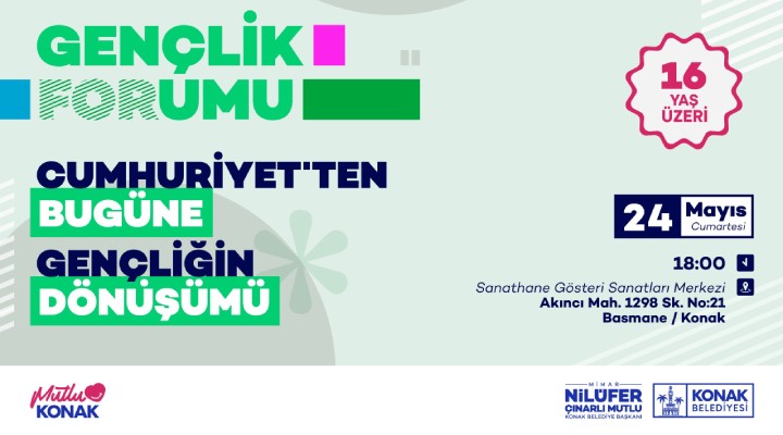 Gençlerin ihtiyaç ve taleplerine yönelik çalışmaları aralıksız sürdüren Konak Belediyesi, önemli bir buluşmaya ev sahipliği yapmaya hazırlanıyor. İzmirli gençler, beklentilerini, taleplerini ve geleceği dair hayallerini konuşmak için 24 Mayıs Cumartesi günü düzenlenecek “Cumhuriyet’ten Bugüne Gençliğin Dönüşümü” konulu Gençlik Forumu’nda bir araya geliyor. Basmane’de bulunan Sanathane Gösteri Sanatları Merkezi’nde saat 18.00’da başlayacak olan forum, 16 yaş ve üzere gençlerin katılımına açık olacak. Forum, gençlerin düşüncelerini ve taleplerini özgürce paylaşabilecekleri bir ortam sunmayı hedefliyor.