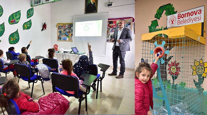 İlçedeki tüm okullara geri dönüşüm kutuları koyan ve biriken atıkları sadece bu alan için kullandığı yedi araçla toplayan Bornova Belediyesi, hem okullarda hem de ortağı olduğu Urban Rec Projesi kapsamında tamamen yenilediği Işıkkent’teki Geri Dönüşüm Merkezi’nde farkındalık eğitimleri düzenliyor. Temizlik İşleri Müdürlüğü bünyesinde görev yapan iki çevre mühendisi, merkezdeki seminer odasında çocuklara geri dönüşümün ne olduğunu, atıkların doğada hangi sürelerle yok olduğunu ve nasıl ayrıştırılması gerektiğini görsel sunumlar ve çizgi fimler eşliğinde anlatıyor. Çocuklar getirdikleri atıkları merkez bulunan geri dönüşüm kutularına atıyor.