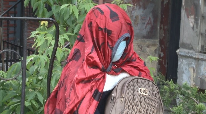 Yüzünde cerrahi maske bulunan kadın üzerini ve yüzünü ise berber önlüğüyle örtüyor.