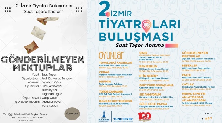 2. İzmir Tiyatroları Buluşması’nda 24 Ekim’de Çiğli Belediyesi Fakir Baykurt Salonu’nda Suat Taşer’in eseri “Gönderilemeyen Mektuplar” izleyici ile buluşacak. Prof. Dr. Murat Tuncay’ın oyunlaştırdığı, Bilgehan Oğuz’un yönettiği oyunda Hilmi Altınkaya, Yücelay Sal, Bilgehan Oğuz oynuyor.