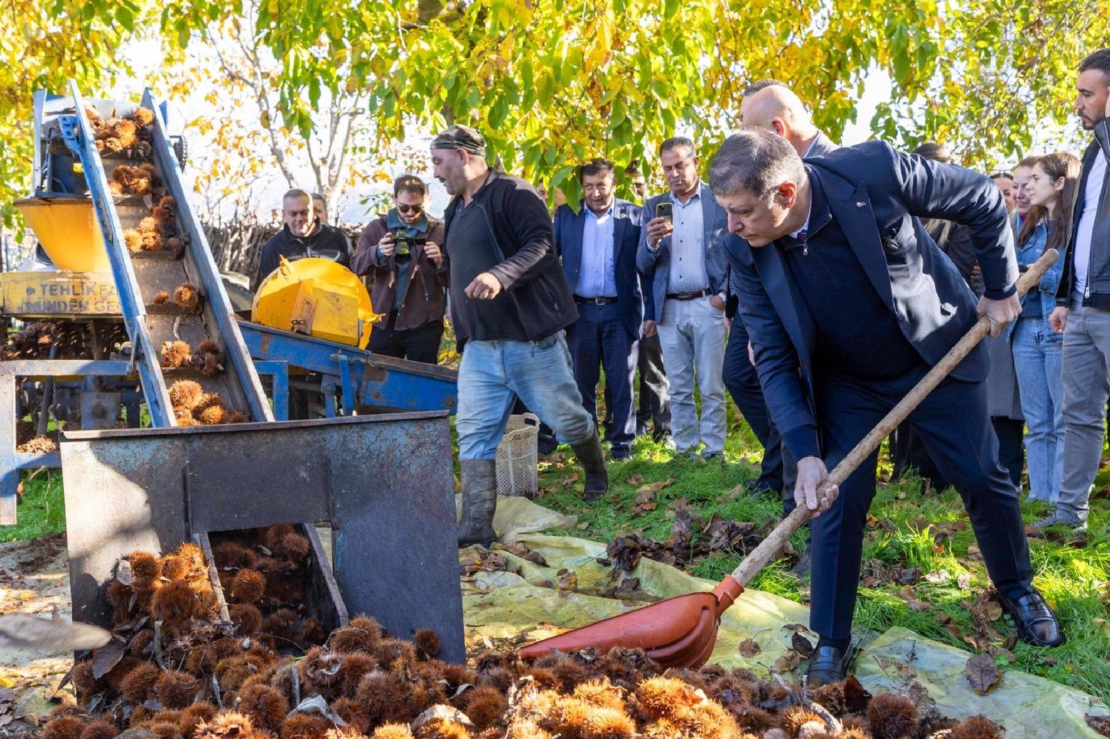 Küçük Menderes Havzası’nın zengin topraklarından yetişen, lezzetiyle ün yapan Beydağ kestanesinde hasat devam ediyor. Bölgenin kestane üreticileriyle buluşmak için Beydağ’a giden İzmir Büyükşehir Belediye Başkanı Dr. Cemil Tugay, Erikli Mahallesi’nde kestane hasatına katıldı. Başkan Dr. Cemil Tugay’a Beydağ Belediye Başkanı Şakir Başaran, İzmir Büyükşehir Belediyesi Genel Sekreter Yardımcısı Halit Çelik, belediye bürokratları, muhtarlar ve Beydağlı üreticiler eşlik etti. Erikli Mahallesi’ndeki köy meydanında geleneksel usullerle hazırlanan kestaneler fırınlara yerleştirildi. Başkan Tugay, program kapsamında zeytin hasadı yaptı ve yeni zeytin fidanlarını toprakla buluşturdu.