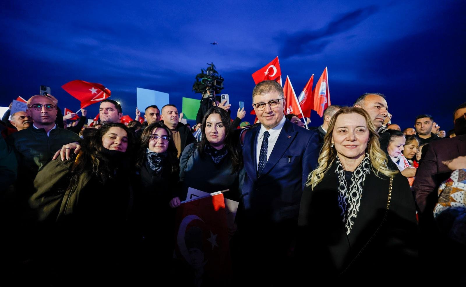 Alana İzmirlilerle birlikte yürüyerek giren Başkan Tugay, konuşmasının ardından yurttaşlarla sohbet etti ve gençlerin yürüyüşüne katıldı.