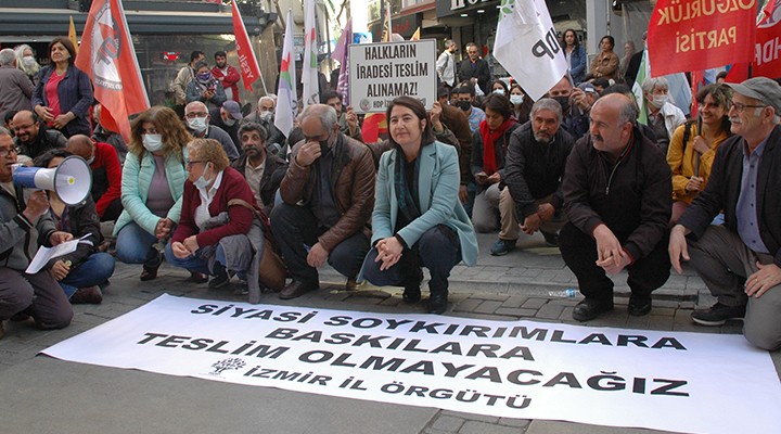 HDP İzmir İl Başkanlığı'nın çağrısıyla Alsancak Türkan Saylan Kültür Merkezi önünde toplanan HDP'liler "HDP halktır, halk burada", "Direne direne kazanacağız" sloganları atıp, "Siyasi soykırımlara, baskılara teslim olmayacağız" pankartı açtı.