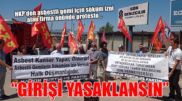SONKALEİZMİR-Halkın Kurtuluş Partisi (HKP) üyeleri, bünyesinde yüzlerce ton asbest barındırdığı iddia edilen Nae Sao Paulo savaş gemisinin sökümünün yapılacağı Aliağa'daki SÖK Denizcilik firması önünde toplandı. HKP'liler "Asbest kanser yapar, öldürür", "Asbestli gemilerin sökümüne izin vermek halk düşmanlığıdır” yazılı pankartlar açtı.