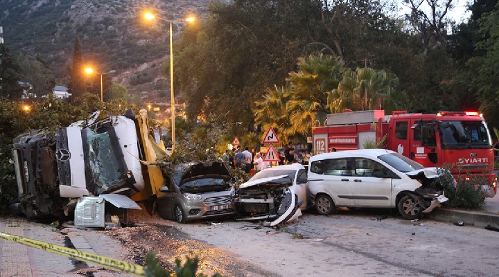 Defne ilçesi Harbiye Mahallesi'nde saat 18.00 sıralarında yokuş aşağı seyir halindeki kum yüklü hafriyat kamyonu, freni tutmayınca önündeki 2'si seyir halinde 9 araca çarparak devrildi.