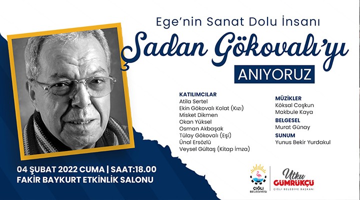 Kültür ve Sosyal İşler Müdürlüğü’nün organize edeceği etkinlik 4 Şubat Cuma günü saat 18:00’de Fakir Baykurt Etkinlik Salonu’nda gerçekleştirilecek. Etkinliğe CHP İzmir Milletvekili Atila Sertel, Şadan Gökovalı’nın eşi Tülay Gökovalı ve kızı Ekin Gökovalı Kolat, İzmir Gazeteciler Cemiyeti önceki dönem başkanlarından Misket Dikmen, şair Ünal Ersözlü ile yazarlar Okan Yüksel, Osman Akbaşak, ve Veysel Gültaş katılım gösterecek. Yunus Bekir Yurdakul’un moderatörlüğünde gerçekleştirilecek etkinlikte Köksal Coşkun ve Makbule Kaya’nın müzik dinletisinin ardından Murat Günay’ın yönetmenliğini yaptığı belgesel gösterimi yapılacak. Etkinliğe konuşmacı olarak katılacak olan yazar Veysel Gültaş sevilen kitaplarını okurları için imzalayacak.