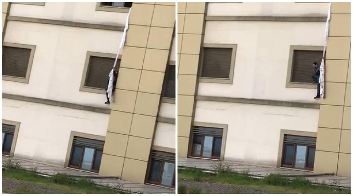 Pencereden çarşafları birbirine bağlayan hasta, zemine inip, kaçmayı palanladı. Bağladığı çarşafları camdan sarkıtıp, tutunarak inmeye çalışan hasta, büyük hayal kırıklığı yaşadı. Çarşafların boyu zemine kadar ulaşmayınca şüpheli, 1'inci kat hizasında mahsur kaldı. Bir kişinin havada asılı olduğunu fark eden vatandaşlar, hastane yönetimine bilgi verdi. Harekete geçen güvenlik ekipleri, hastanenin arka bahçesinden kaçmaya çalışan kişiyi, bulunduğu yerden kurtardı.