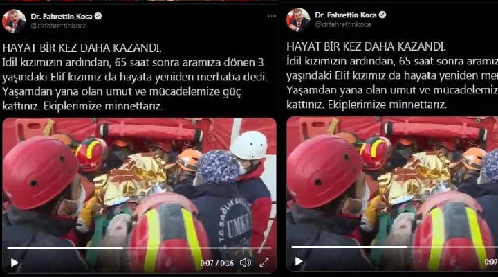Bakan Koca, Twitter hesabından, İzmir'in Seferihisar ilçesi açıklarındaki 6.6 büyüklüğündeki depremde Bayraklı'da yıkılan Doğanlar Apartmanı'nın enkazında mahsur kalan Elif Perinçek'in 65 saat sonra yaralı olarak kurtarılmasına ilişkin açıklamada bulundu. Elif'in kurtarılma görüntülerini paylaşan Bakan Koca, "Hayat bir kez daha kazandı. İdil kızımızın ardından, 65 saat sonra aramıza dönen 3 yaşındaki Elif kızımız da hayata yeniden merhaba dedi. Yaşamdan yana olan umut ve mücadelemize güç kattınız. Ekiplerimize minnettarız" ifadesini kullandı.