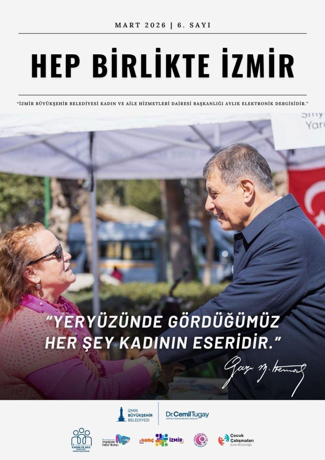 İzmir Büyükşehir Belediye Başkanı Dr. Cemil Tugay’ın eşit yurttaşlık, kapsayıcı sosyal belediyecilik ve çocuk dostu kent çalışmaları doğrultusunda hazırlanan Hep Birlikte İzmir bülteninin yeni sayısında 8 Mart Dünya Emekçi Kadınlar Günü kapsamında gerçekleştirilen etkinlikler geniş yer tutuyor. “Aramızda Eşitlik Var” temasıyla düzenlenen programlar, kadın emeğini görünür kılan buluşmalar ve toplumsal cinsiyet eşitliğini güçlendiren çalışmalar bültenin öne çıkan başlıkları arasında yer alıyor.
