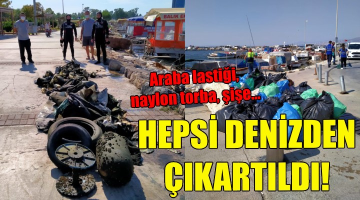 İtfaiye dalgıç ekibi de denizde dip temizliği yaptı. Denizden ve kıyıdan araba lastiği, naylon torba, hurda malzeme, şişe ve içecek kutuları çıktı.