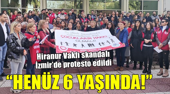 SONKALEİZMİR-DİSK Genel İş İzmir Kadın Komisyonları ve sendika üyeleri bugün Kültürpark 1 No'lu Hol önünde toplandı. Hiranur Vakfı kurucusu Yusuf Ziya Gümüşel’in kızının evlendirilerek 6 yaşından itibaren cinsel istismara uğramasına tepki gösteren DİSK üyeleri, "Bu ülkede dokunulmazlık milletvekillerinin değil çocukların hakkı olmalı" yazılı pankart taşıdı, "Henüz 6 yaşında", "AKP elini bedenimden çek", "AKP'li bakan, çocukları yakan" sloganları attı.