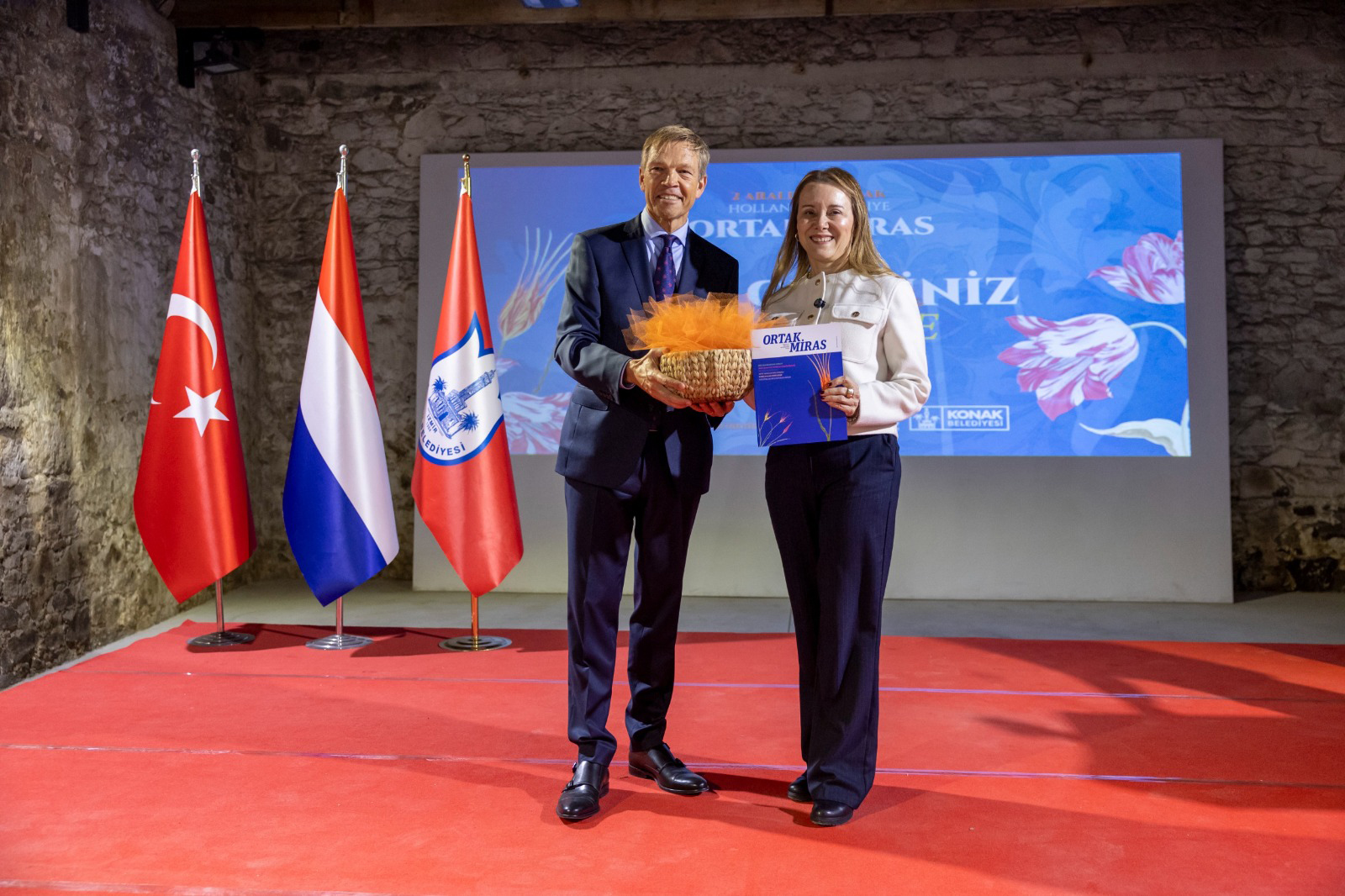 Konak Belediyesi ile Hollanda Krallığı Ankara Büyükelçiliği’nin birlikte hazırladığı, Türkiye ve Hollanda arasında 400 yılı aşkın süredir devam eden keşif, ticaret ve kültürel etkileşimin izlerini günümüze taşıyan Ortak Miras Sergisi Tarihi Bıçakçı Han’da açıldı. Konak Belediye Başkanı Nilüfer Çınarlı Mutlu’nun ev sahipliği yaptığı serginin açılış törenine Hollanda’nın Ankara Büyükelçisi Joep Wijnands, Hollanda İzmir Fahri Konsolosu Oğuz Özkardeş, Hollanda başta olmak üzere çeşitli ülkelerin konsolosluk temsilcileri, Konak Belediyesi Meclis Üyeleri ve bürokratları, serginin önemli eserlerinden Pieter de Hooch tablosundan alınan Bergama Halısı’nı dokuyan kadınlar, akademisyen ve sanatçılar ile muhtarlar katıldı. İki ülkenin geçmişten günümüze uzanan ortak mirasının dikkat çekici yönlerinin ele alındığı sergide, Pieter de Hooch tablosunda yer alan ve kadın kooperatiflerinin katkılarıyla can bulan Bergama Halısı başta olmak üzere, Kahramanmaraş depremlerinde Hollanda yardım derneklerinin depremzede çocuklarla gerçekleştirdiği atölye çalışmasında üretilen İnci Küpeli Kız tablosunun patchwork uygulaması, Delft Mavisi çiniler, iki ülke arasında dikkat çeken değerlerden lalelerle ilgili çalışmalar ve lale soğanları, Türkiye ve Hollanda arasındaki ticaret ve diplomasiyi temsilen Levanten bağlantısını anlatan çalışmalar, mimari ve sanat alanındaki ortak eserlerin tasvirleri ve kültürel mirasın pek çok ortak değeri yer aldı.
