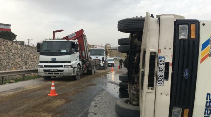 Bornova'da 5'inci Sanayi Sitesi'nden kamyonuna yüklediği hurdaları Kemalpaşa’ya götürmek üzere dün saat 13.00 sıralarında yola çıkan Nurullah Direk, Kemalpaşa Caddesi'ne geldiğinde direksiyon hakimiyetini kaybetti. Kontrolden çıkan kamyon, devrilirken olay yerine ihbar üzerine 112 sağlık ekipleri, polis ve itfaiye ekipleri sevk edildi. Devrilen kamyondan kendi imkanları ile çıkan ve kazayı hafif sıyrıklarla atlatan sürücü Nurullah Direk'e ilk müdahale sağlık ekipleri tarafından olay yerinde yapıldı. Devrilen kamyondan yola yayılan mazotun üzerine kum dökülerek trafik bir süre tek şeritten verildi. Polis kazayla ilgili soruşturma başlattı.