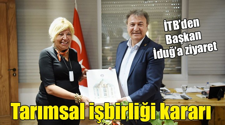 İzmir Ticaret Odası ve İzmir Sanayi Odası ile işbirliği yaptıklarını da ifade eden Başkan İduğ, “Bornova’da kendilerine özel bir yer tahsis ettik. Yakın zamanda ilçemizde şubeleri olacak. İzmir Ticaret Borsası’nın da burada yer alması bizi mutlu eder. Vatandaşlarımızın da işlerini kolaylaştırır” diye konuştu. İzmir Ticaret Borsası Yönetim Kurulu Başkanı Işınsu Kestelli ise Türkiye’nin ilk borsası olduklarını belirterek, “Önümüzdeki yıl 130. yılımızı kutlayacağız. Tarım alanında birçok konuda ilklere imza attık. Yeni projelerimizle yolumuza devam ediyoruz. Bornova Belediyesi ile de güzel işler çıkaracağımıza inanıyorum”dedi. Başkan Mustafa İduğ, Kestelli’ye içinde ‘Bornova’ markasının ürünlerinin olduğu bir sepet hediye etti.