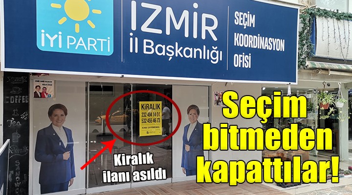 İzmir'in yoğun bölgelerinden Alsancak Mimar Sinan Mahallesi'nde açılan seçim koordinasyon ofisinin kapısına bu sabah kilit vuruldu. İYİ Parti Genel Başkanı Meral Akşener'in afişleriyle donatılan ofisin camına da kiralık ilanı asıldı. Partinin Bayraklı'daki seçim ofisinin de kapatıldığı bildirildi. Henüz kapatılmayan ve üzerine kiralık afişi asılmayan ofislerin de kapalı tutulduğu ve çalışmadığı görüldü.