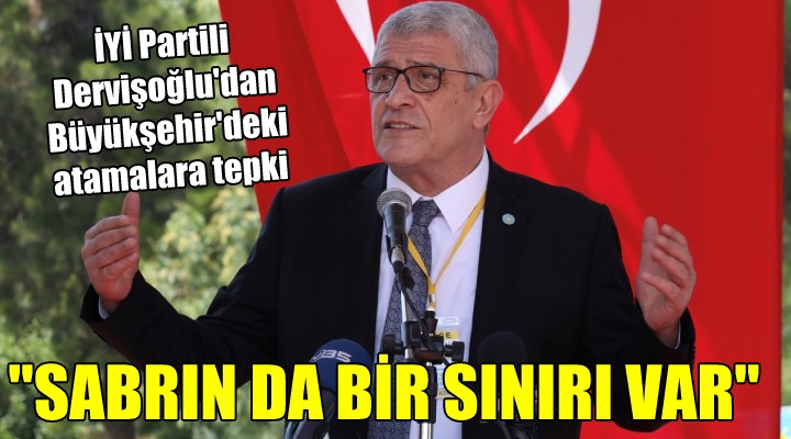 Dervişoğlu, hiçbir belediyeden kendisi veya yakın çevresinin işi için bir talepte bulunmayacağını belirterek şöyle konuştu: "İyi Partinin, Cumhuriyet Halk Partisinin özellikle büyükşehir belediye başkanlığından beklediği sadece iş, aş, vesaire değildir. Cumhuriyet Halk Partili İzmir Büyükşehir Belediye Başkanlığından İYİ Partinin beklediği İzmir'in doğru, ehil insanlarla yönetilmesidir. Siz sadece İYİ Partinin değil, Cumhuriyet Halk Partisinin de sağlam damarını rahatsız eden uygulamalara imza atmaya devam derseniz, toplumsal kaygıyı artırmaktan geri durmayacağınızı göstermeyi sürdürürseniz ‘sabrın da bir sınırı var'."