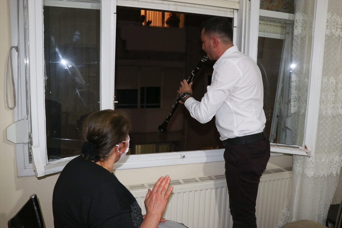 Sokağa çıkma kısıtlamasının başladığı saatlerde enstrümanlarıyla evlerinin balkonuna çıkan Barış Özkaya ve annesi, mahalle sakinlerine bir saat boyunca konser veriyor.