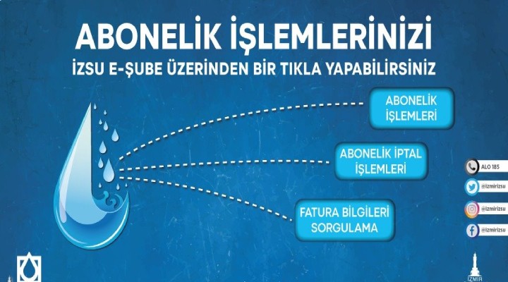 E-şube’den su abonelik işlemi yapabilmek için öncelikle www.izsu.gov.tr üzerinden üye olmak gerekiyor. E-posta adresi ve şifre ile sisteme giriş yapıldıktan sonra “Online İşlemler - E-Şube” sekmesinden isim değişikliği, abonelik iptali ve teminat ödeme işlemleri yapılabiliyor. İsim değişikliği veya iptal işlemi başvurusu yapılan abonelikler için borç bilgisi bulunmaması gerekiyor.