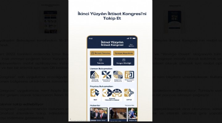 15-21 Mart 2023 tarihleri arasında İzmir Büyükşehir Belediyesi tarafından düzenlenecek ve “Yeniliğe Davet” sloganıyla tüm Türkiye’yi geleceği inşa etmeye çağıran İkinci Yüzyılın İktisat Kongresi’nin mobil uygulaması yayında. Kongreye misafir olarak katılmak ve programı izlemek isteyenlerin mobil aplikasyonu indirerek QR kod indirmesi gerekiyor. Kongreyi fiziksel olarak izlemek için mobil aplikasyonun indirilmiş ve her bir etkinlik için ayrı QR kodları oluşturulması zorunluluk.