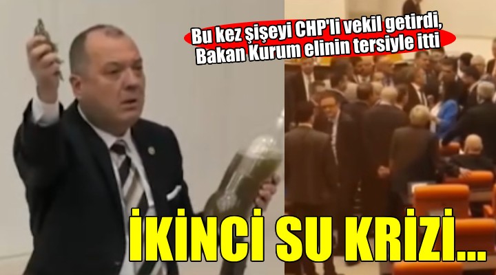 Çevre, Şehircilik ve İklim Değişikliği Bakanı Murat Kurum'un yanına giden CHP'li Aygun elindeki şişeyi masaya bıraktı. Bakan Kurum şişeyi elinin tersiyle itince Meclis bir anda karıştı.
