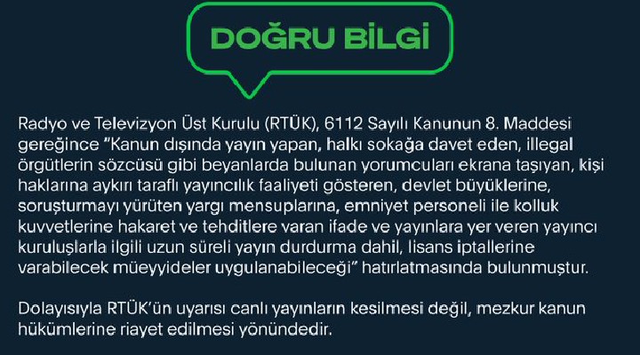 DMM'nin sosyal medya hesabından yapılan açıklamada, "Bazı basın yayın organlarında yer alan ve sosyal medya hesaplarından paylaşılan 'RTÜK’ün talimatıyla televizyonlardaki tüm canlı yayınlar kesildi.” iddiası doğru değildir. RTÜK, 6112 Sayılı Kanunun 8. Maddesi gereğince 'Kanun dışında yayın yapan, halkı sokağa davet eden, illegal örgütlerin sözcüsü gibi beyanlarda bulunan yorumcuları ekrana taşıyan, kişi haklarına aykırı taraflı yayıncılık faaliyeti gösteren, devlet büyüklerine, soruşturmayı yürüten yargı mensuplarına, emniyet personeli ile kolluk kuvvetlerine hakaret ve tehditlere varan ifade ve yayınlara yer veren yayıncı kuruluşlarla ilgili uzun süreli yayın durdurma dahil, lisans iptallerine varabilecek müeyyideler uygulanabileceği' hatırlatmasında bulunmuştur. Dolayısıyla RTÜK’ün uyarısı canlı yayınların kesilmesi değil, mezkur kanun hükümlerine riayet edilmesi yönündedir. Kamuoyunu manipüle etmeye yönelik asılsız iddialara itibar etmeyiniz" denildi.