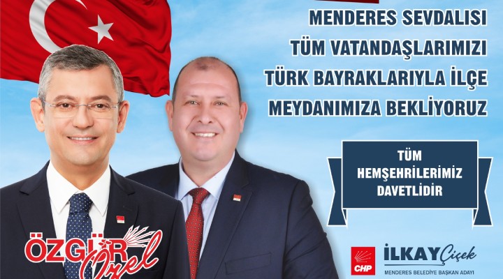 Yerel seçim çalışmalarına yoğun şekilde devam eden CHP Menderes Belediye Başkan Adayı İlkay Çiçek, CHP Genel Başkanı Özgür Özel’in katılımıyla Menderes’te gerçekleşecek halk buluşmasına tüm Mendereslileri davet etti. 13 Mart Çarşamba günü saat 16.00’da ki etkinlik için vatandaşları Türk bayraklarıyla Menderes Meydanı’nda buluşmaya çağıran Çiçek, görsel şölen yaşanacağını söyledi.