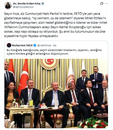 Kılıç, “Sayın İnce, siz Cumhuriyet Halk Partisi’ni terörle, FETÖ’yle yan yana göstermeye kalkıp, “oy vermem, oy da istemem” diyerek Millet İttifakı’nı zayıflatmaya çalışırken, sizin hedef gösterdiğiniz o liderler ve bizler millet ittifakının Cumhurbaşkanı adayı Sayın Kemal Kılıçdaroğlu için sokak sokak, kapı kapı dolaşıp oy istiyorduk. Şu anki bu tutumunuzun da ülke siyasetine hiçbir faydası olmayacaktır” dedi.