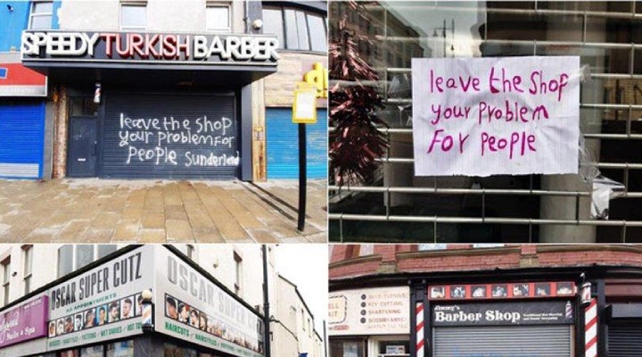 İngiltere’nin Sunderland eyaletinde bulunan Türk berberler son günlerde kabusu yaşıyor… Sunderland’ın şehir merkezinde bulunan Türk berbercilerinin işletmelerinin üzerine ırkçı tehdit mesajları yazıldı.