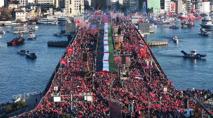 İnsanlık İttifakı ve Milli İrade Platformunca, Filistin'deki katliamın durdurulması amacıyla 400'den fazla sivil toplum kuruluşunun iştirakiyle düzenlenen "Sinmiyoruz, susmuyoruz, Filistin'i unutmuyoruz" mitingi için sabah namazında camilerde bir araya gelen on binlerce katılımcı, kortejlerle Galata Köprüsü'ne doğru yürüyüşe başladı.