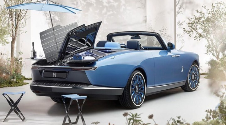 Aracın arka kısmında bir yemek takımı, döner kokteyl masaları, sandalyeler ve hatta kendiliğinden açılan bir güneş şemsiyesi bulunuyor. Rolls-Royce özel tasarım olarak üretilen aracın sahiplerinin ismini ise açıklamadı.