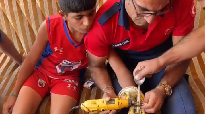 Çocuğun bileğinden tüm uğraşlara rağmen kelepçeyi çıkaramayan aile, Mardin Büyükşehir Belediyesi'ne bağlı Nusaybin itfaiyesine giderek, yardım istedi. Ekipler, elektrikli kesiciyle çocuğun bileğindeki kelepçeyi keserek çıkardı. Aile, çocuğun yara almamasına sevinerek, itfaiye ekiplerine teşekkür etti.