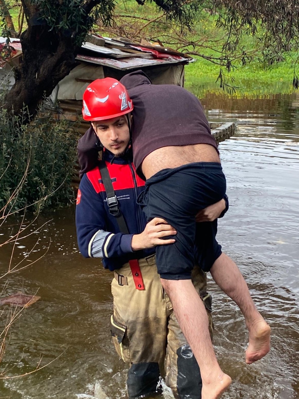 İzmir’de etkili olan şiddetli yağış sırasında boş arazideki barakaya sığınan bir kişi suların yükselmesiyle birlikte bulunduğu yerde mahsur kalınca itfaiye ekiplerine haber verildi. Olay yerine gelen İzmir İtfaiyesi’nde görevli Alper Aksular zor durumdaki vatandaşı çevresi suyla kaplı barakadan sırtında taşıyarak çıkardı