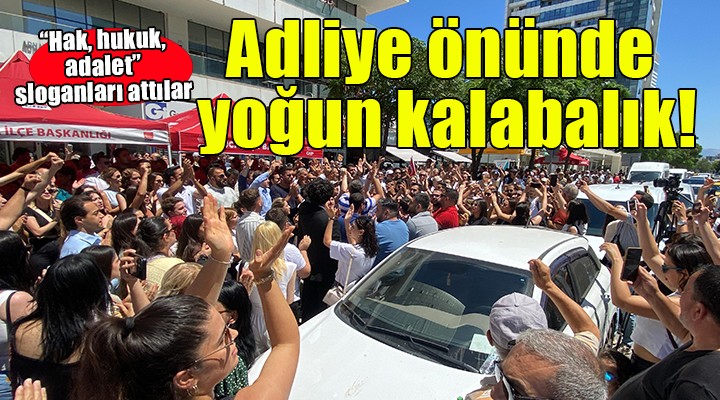 Adliye önünde ise yoğun bir kalabalık oluştu. CHP İzmir İl Örgütü üyeleri adliye önünde "Hak, hukuk, adalet", "Kurtuluş yok tek başına. Ya hep beraber ya hiç birimiz" sloganları attı. Adliye önünde CHP Genel Başkan Yardımcıları Deniz Yücel ve Murat Bakan'ın açıklama yapması bekleniyor.